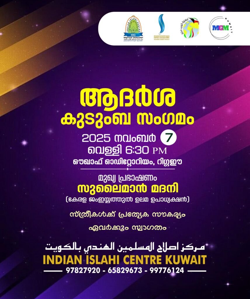 ഇന്ത്യൻ ഇസ്ലാഹി സെന്റർ കുവൈറ്റ് സംഘടിപ്പിക്കുന്ന “ആദർശ കുടുംബ സംഗമം ” ഈ വരുന്ന വെള്ളിയാഴ്ച റിഗ്ഗഈ ഓഡിറ്റോറിയത്തിൽ വെച്ച് നടക്കും. പരിപാടിയിൽ കേരളം ജംഇയ്യത്തുൽ ഉലമ വൈസ് പ്രസിഡണ്ട് സുലൈമാൻ മദനി മുഖ്യ പ്രഭാഷണം നടത്തും. സ്ത്രീകൾക്ക് പ്രത്യേക സൗകര്യം ഏർപെടുത്തിയിട്ടുണ്ട്.
